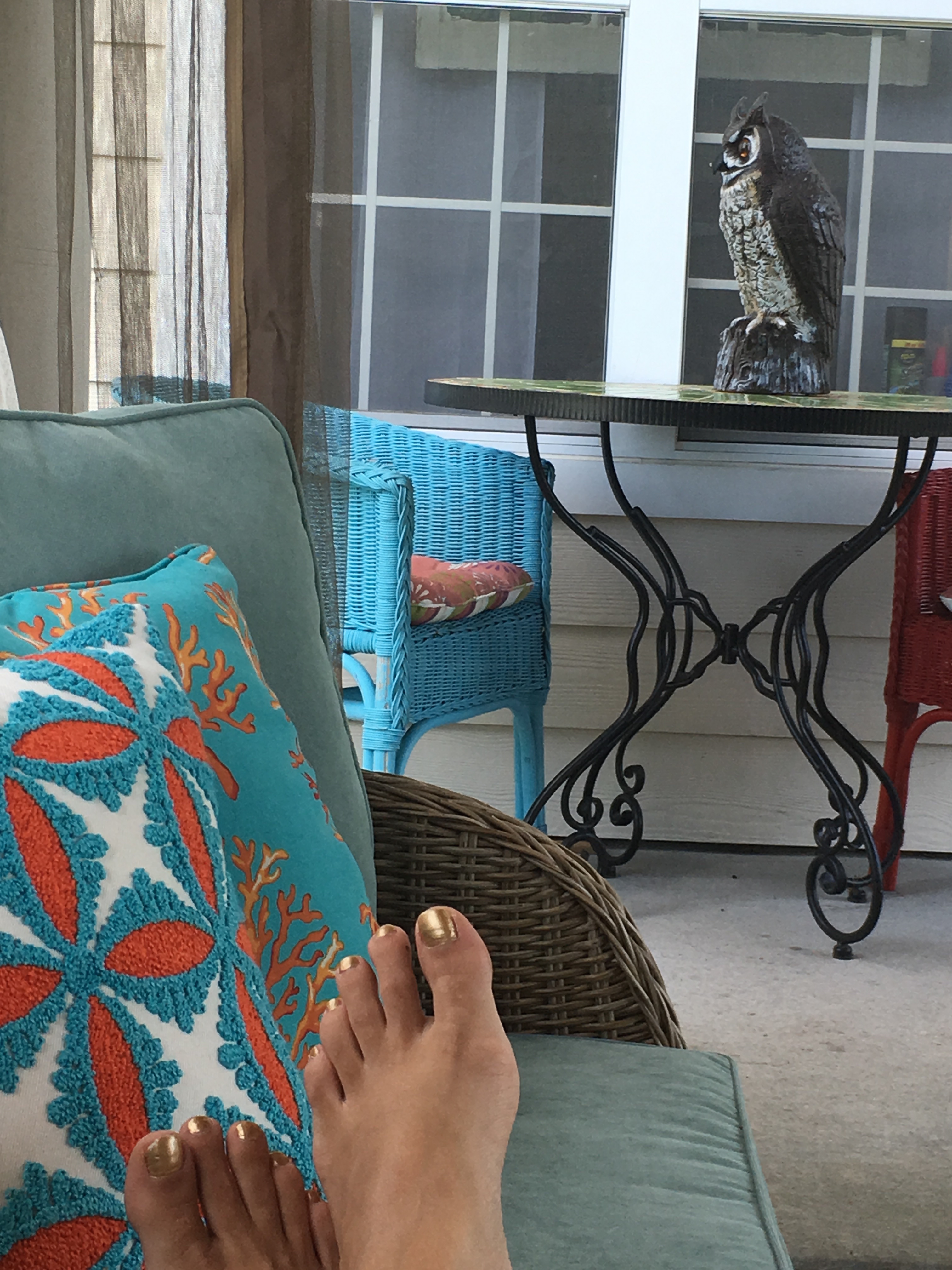 Home again, home again…and staking out my territory after the birds tried to invade (note big plastic sentry owl).